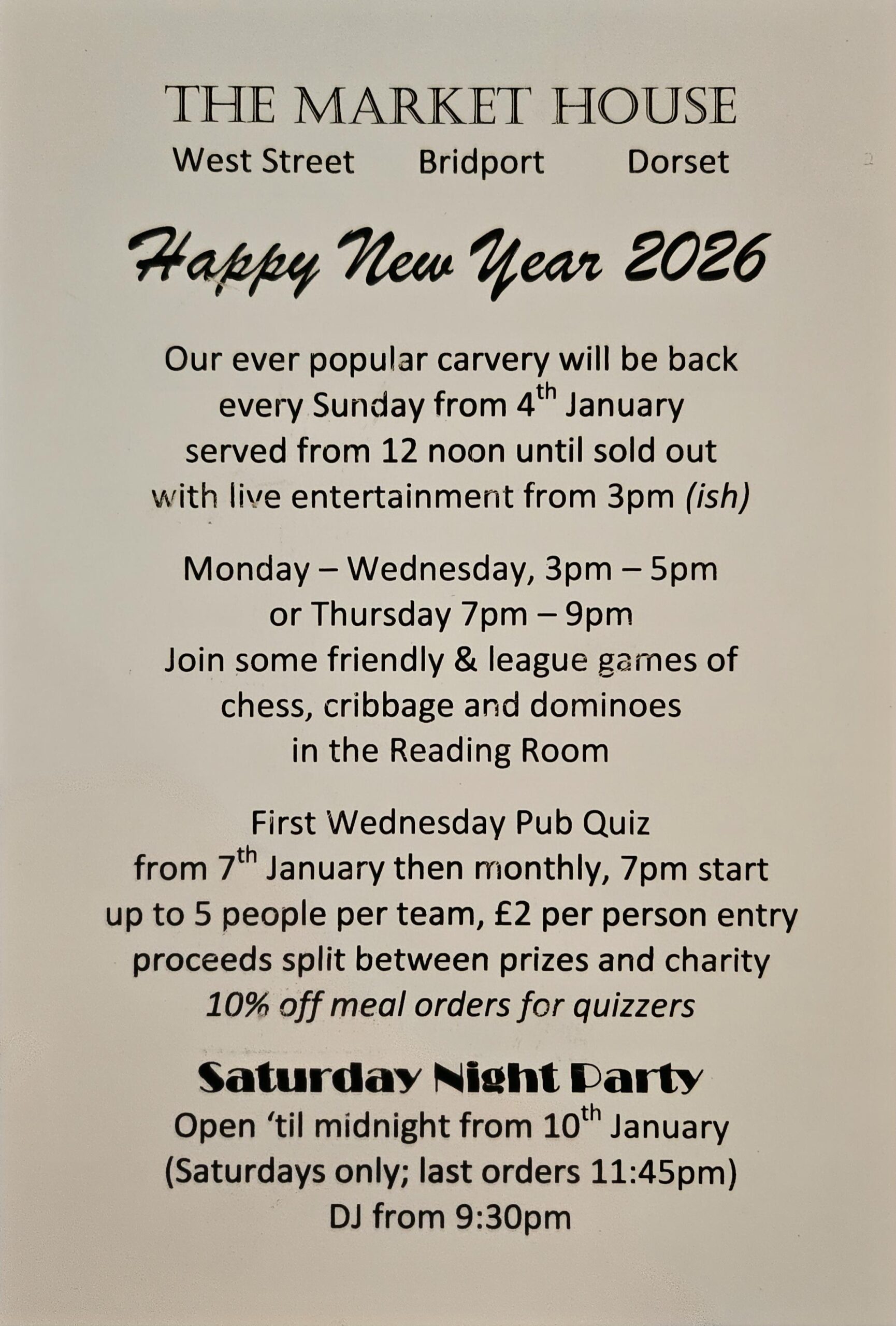 Open ’til Midnight from 10th January every Saturday (last orders 11.45pm)